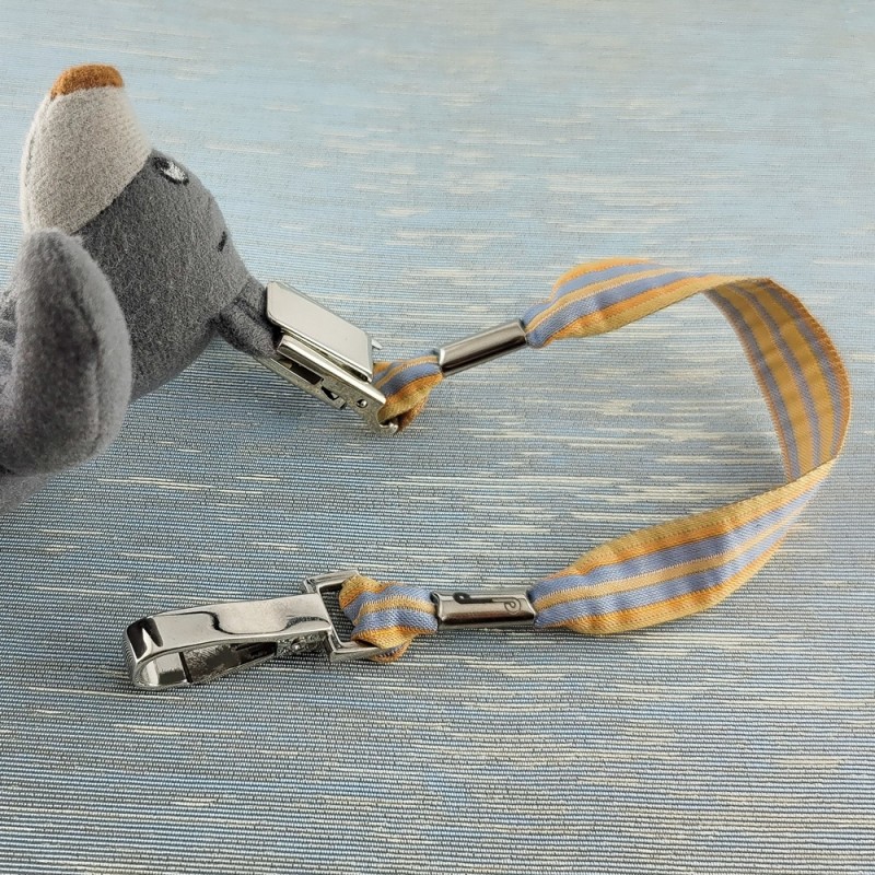 Attache-doudou muni d’un mousqueton pour accrocher un doudou à l'anneau d'une écharpe de portage.