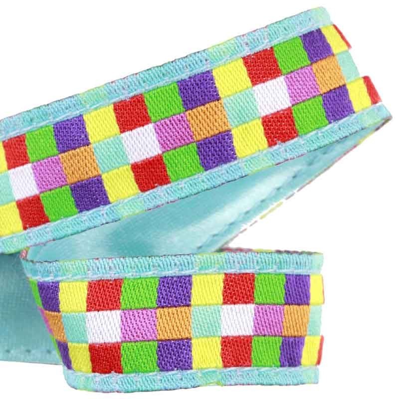 Attache-doudou / Attache-serviette avec une lanière tissée d'une mosaïque multicolore doublée de satin.