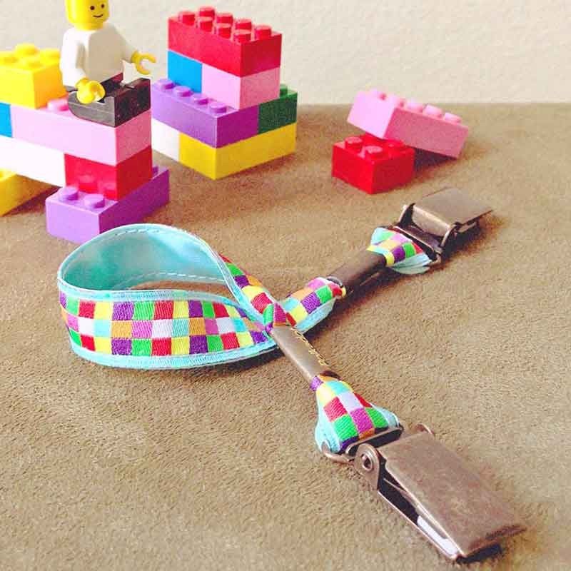 Attache-doudou / Attache-serviette avec un ruban jacquard tissé d'une mosaïque multicolore.