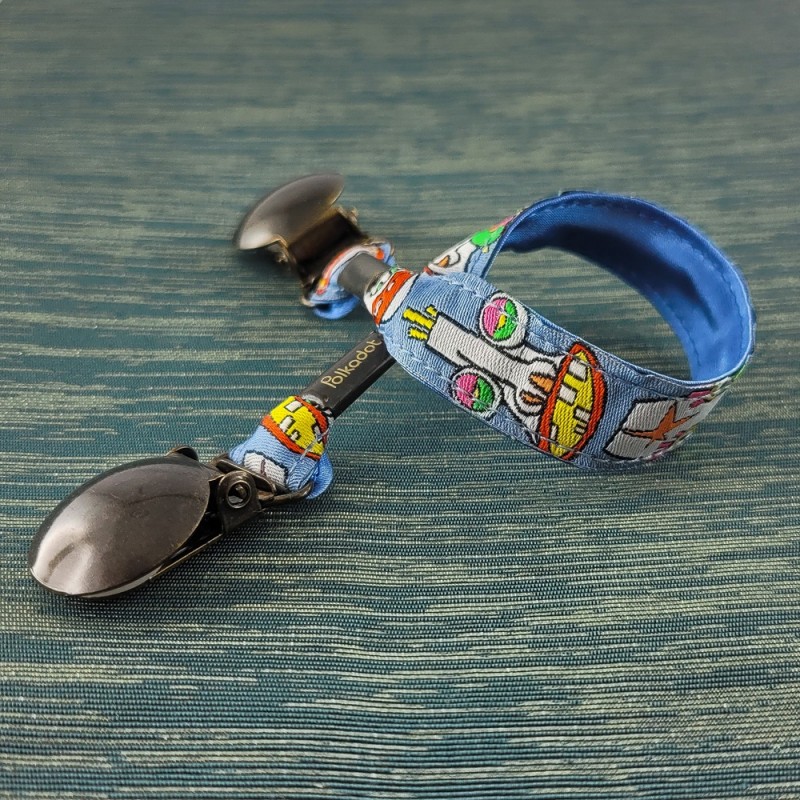 Attache-doudou / Attache-serviette avec un ruban jacquard tissé de têtes rigolotes.
