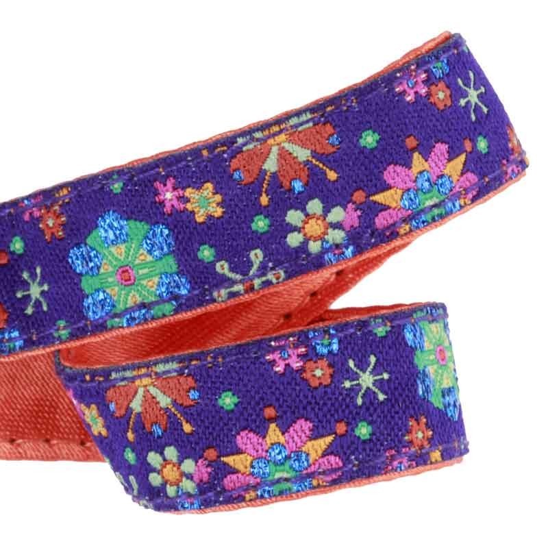 Attache-doudou / Attache-serviette avec une lanière bleu nuit tissée de fleurs qui brillent doublée d'un satin.