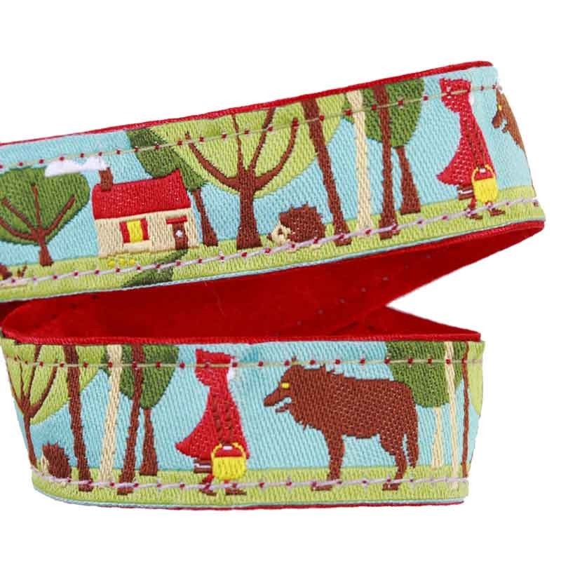Attache-doudou / Attache-serviette avec une lanière tissée à l'effigie du petit Chaperon rouge doublée d'un satin.