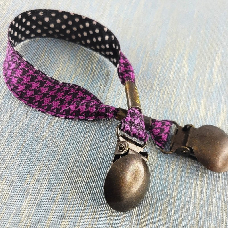 Attache-doudou / Attache-serviette avec une lanière en coton pied de poule violet doublée d'un satin à pois.