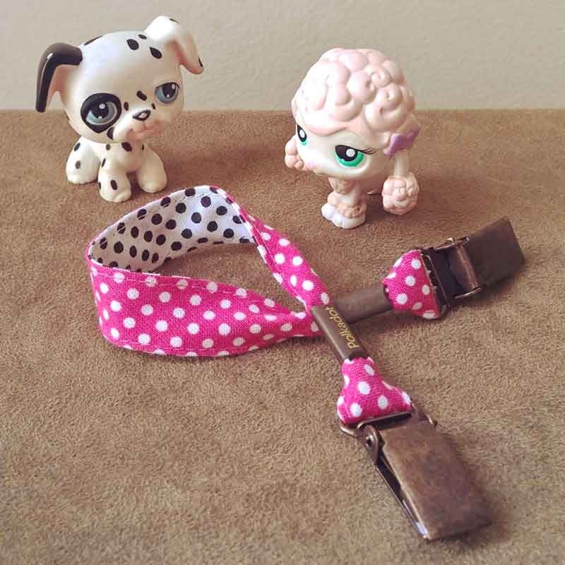 Attache-doudou / Attache-serviette avec une lanière en coton à pois rose et noir.
