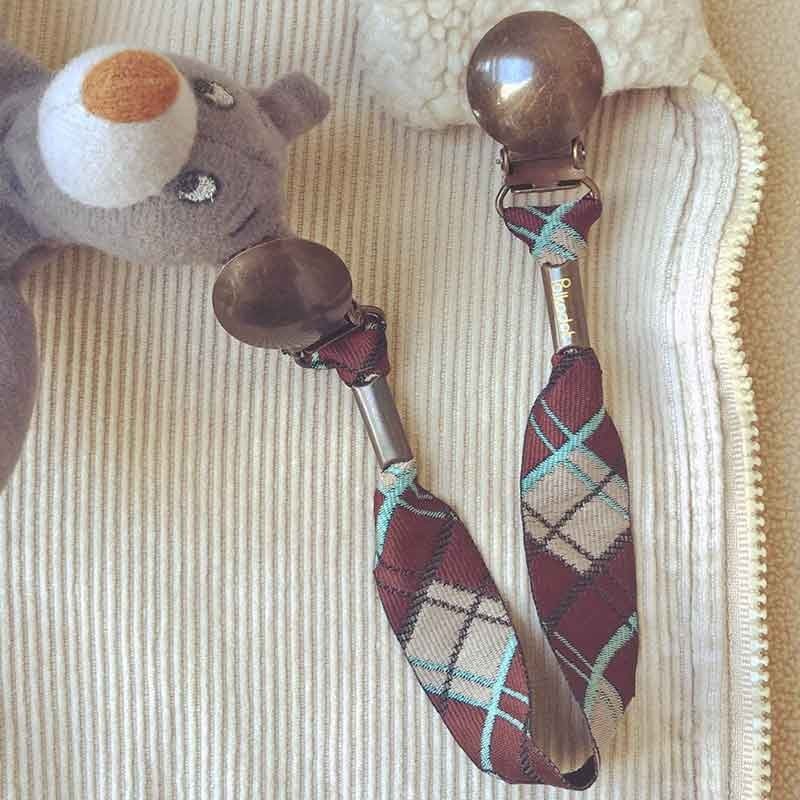 Attache-doudou / Attache-serviette avec un large ruban Écossais marron et bleu.