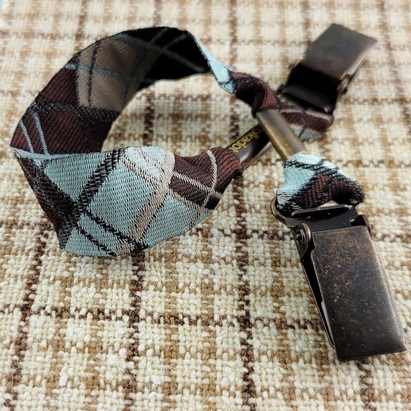Attache-doudou / Attache-serviette avec une lanière tissée d'un motif écossais marron et bleu.