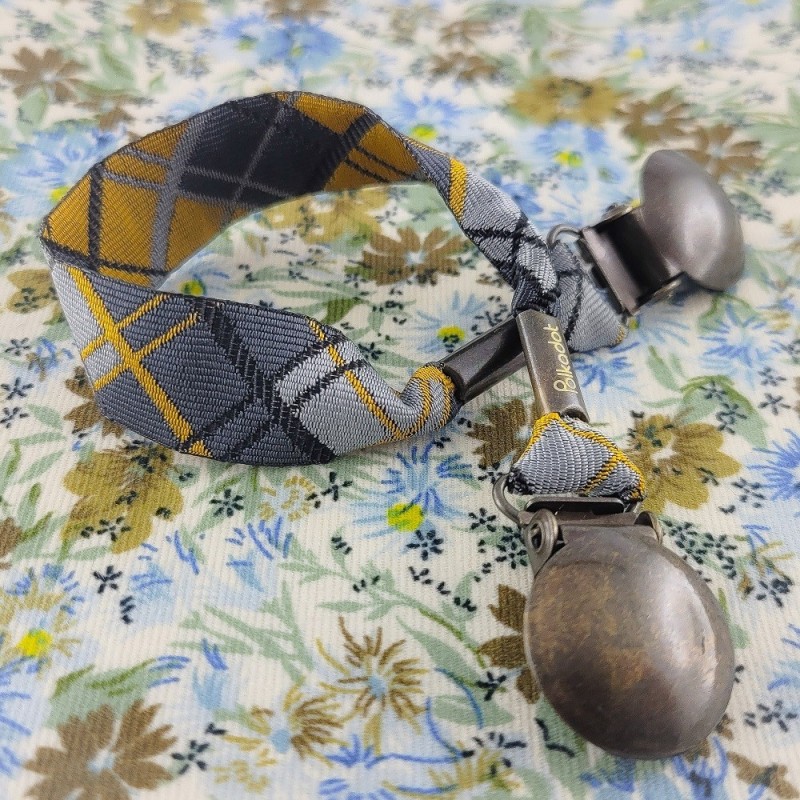 Attache-doudou / Attache-serviette avec une lanière tissée d'un motif écossais jaune et gris.