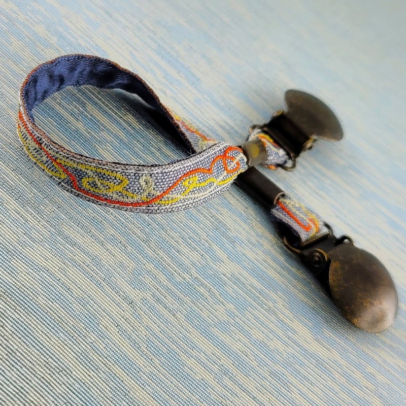 Attache-doudou / Attache-serviette avec une lanière tissée d'un motif géométrique gris doublée de satin.