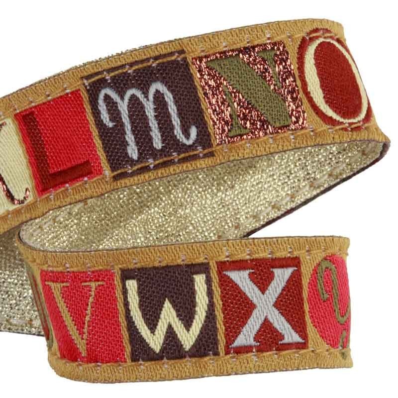 Attache-doudou / Attache-serviette avec une lanière rococo tissée des lettres de l'alphabet doublée d'un lamé Or.