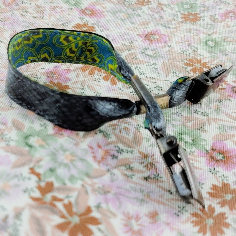 Attache-doudou / Attache-serviette avec une lanière simili cuir gris doublée d'un biais coton d'inspiration africaine.