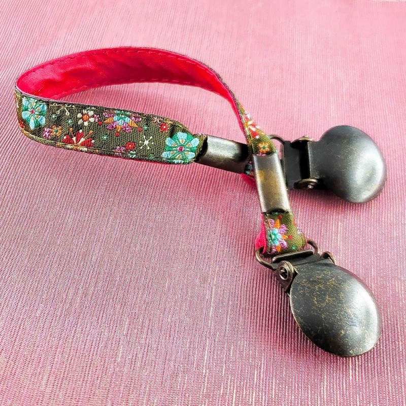 Attache-doudou / Attache-serviette avec une lanière kaki tissée de fleurs qui brillent doublée d'un satin.