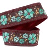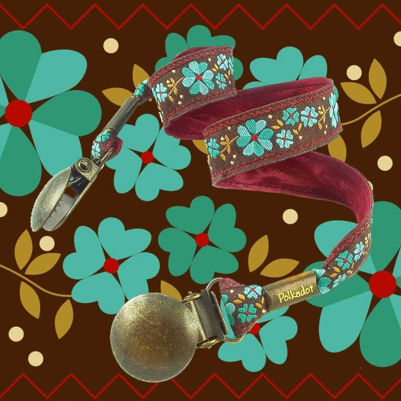 Attache-serviette adulte avec un joli ruban jacquard tissé de fleurs turquoise doublé d'un satin rouge bordeaux à porter autour du cou pour manger sans se tacher ! Ce motif floral d'inspiration slave a été dessiné par POLKADOT.