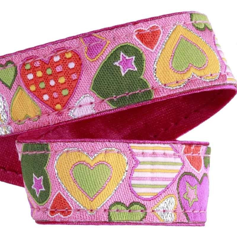 Attache-tétine avec une dragonne rose tissée de coeurs qui brillent doublée d'un satin.