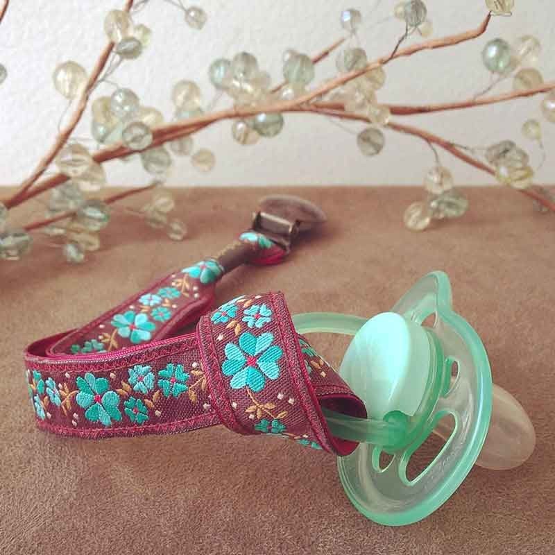 Attache-tétine avec une dragonne tissée de fleurs turquoise doublée de satin.