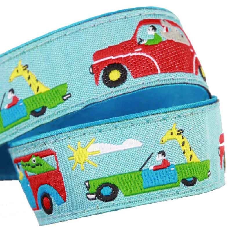 Attache-tétine avec une dragonne tissée d'animaux sauvages qui paradent en voiture doublée de satin.