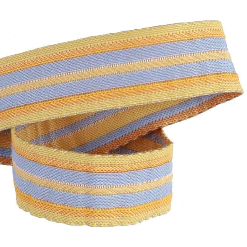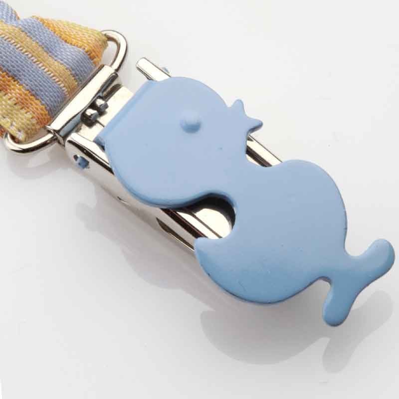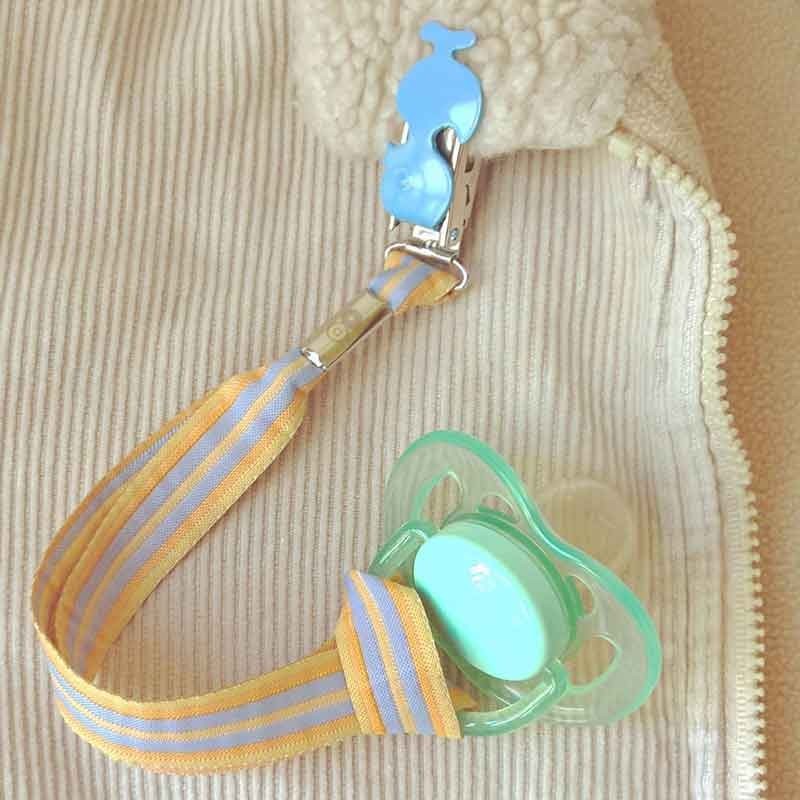 Attache-tétine avec une dragonne en ruban épais à rayures et munie d'une pince fantaisie en forme de poussin.