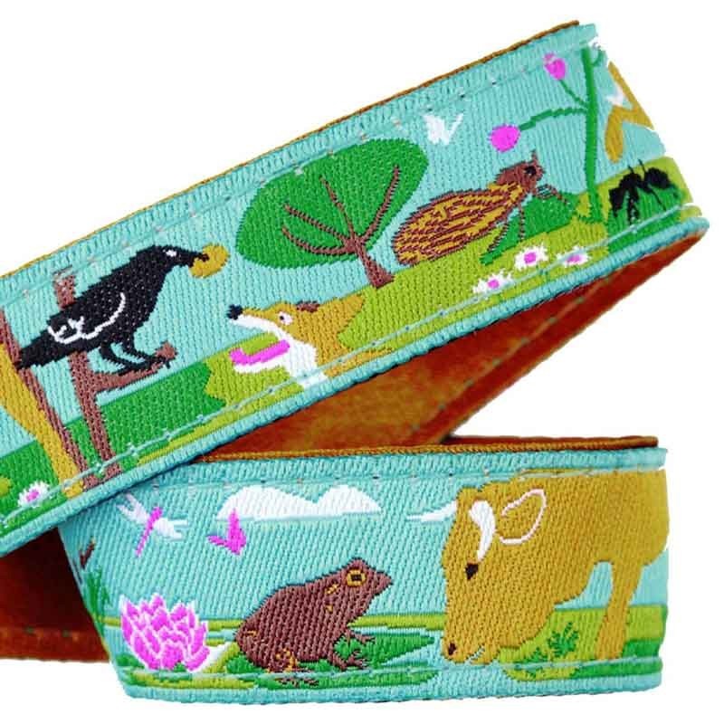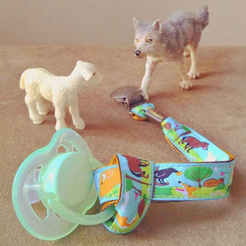 Attache-tétine inédite avec un ruban jacquard tissé à l'effigie des fables de La Fontaine.