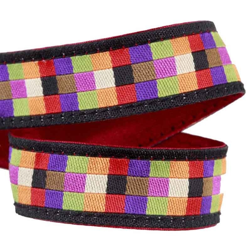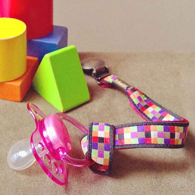 Attache-tétine avec une jolie dragonne tissée d'une mosaïque multicolore doublée de satin.