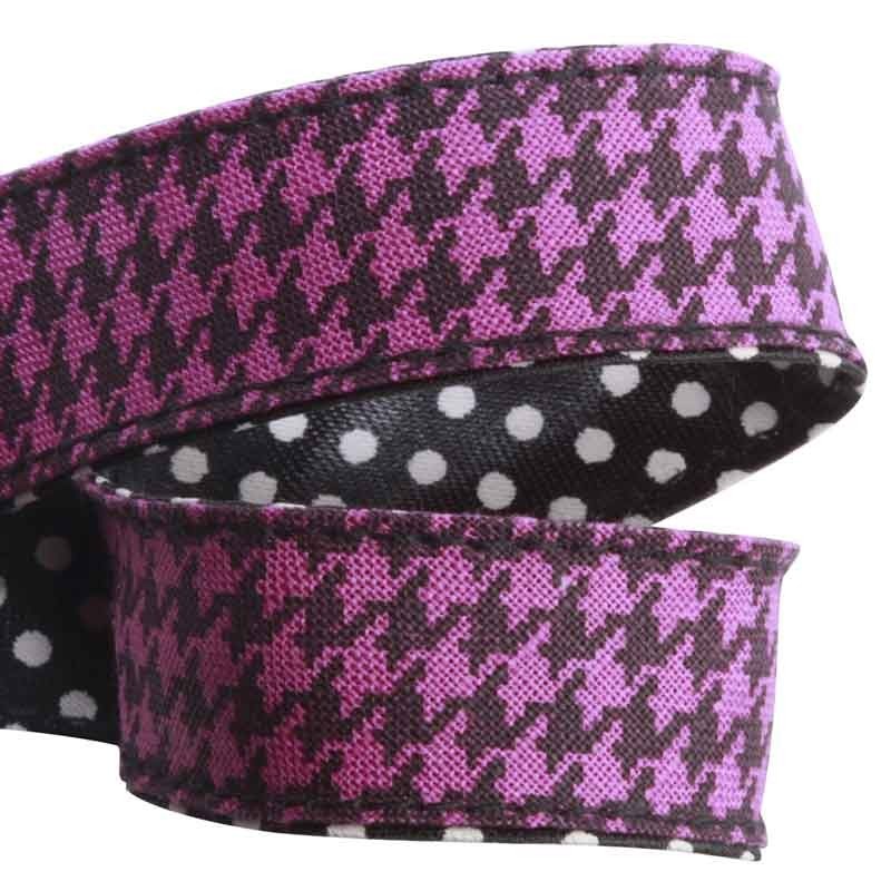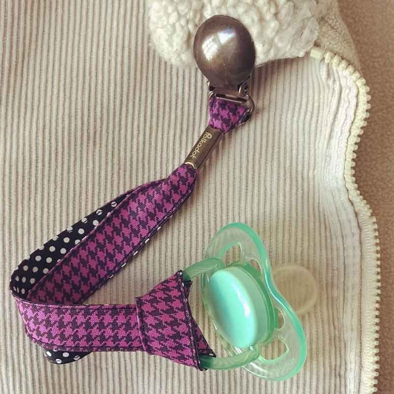 Attache-tétine avec une dragonne en coton pied de poule violet doublée d'un satin à pois.