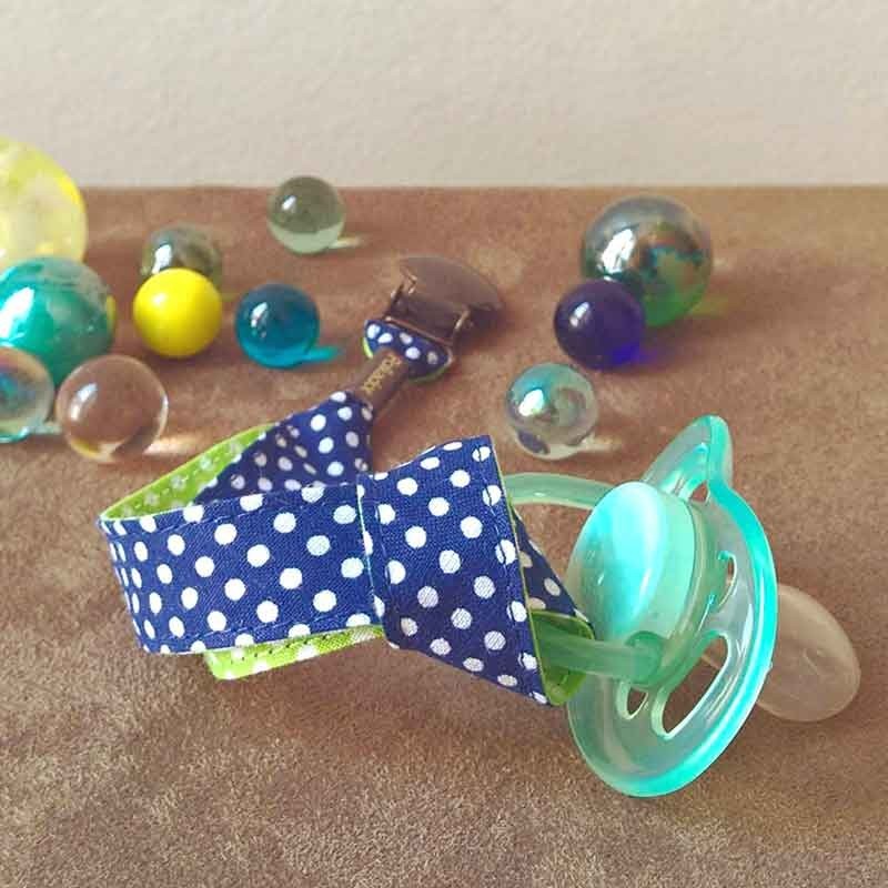 Attache-tétine avec une dragonne en coton à pois bleu marine et vert anis.