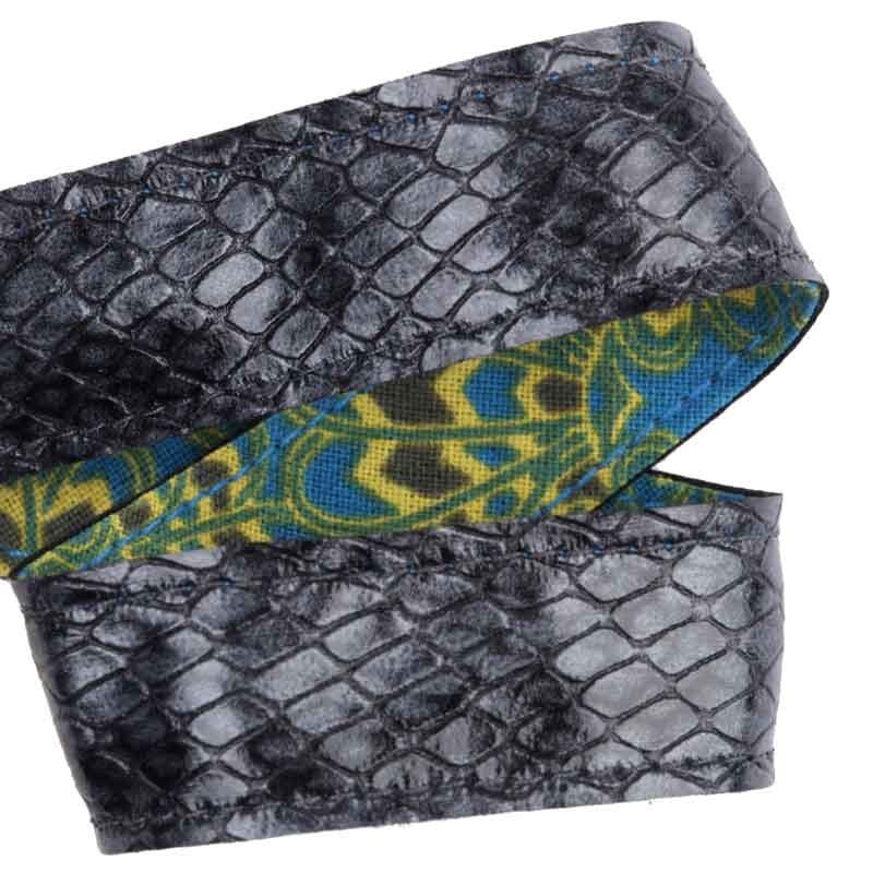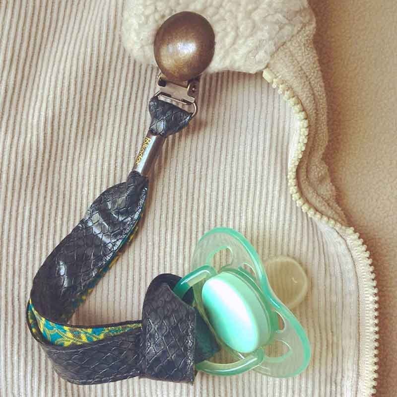 Attache-tétine avec une dragonne simili cuir gris doublée d'un biais coton d'inspiration africaine.