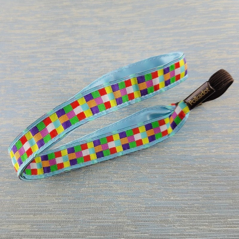 Bandeau cheveux pour enfant avec un ruban tissé d'une mosaïque multicolore doublé de satin.