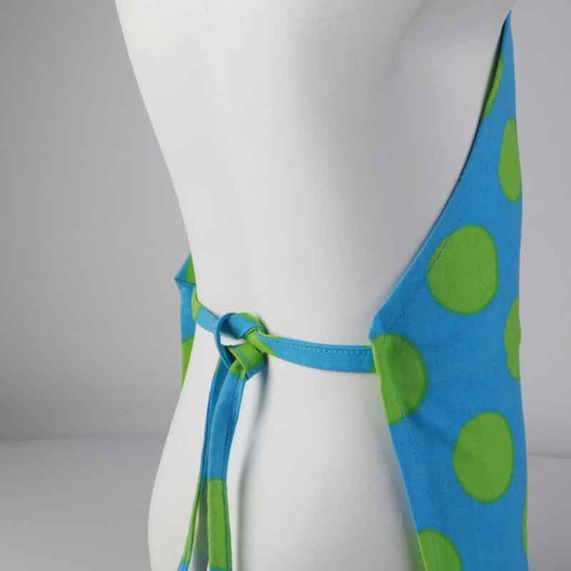 Tablier pour enfant muni d’un cordon élastique avec un tissu coton vert et bleu imprimé de gros pois rigolos.