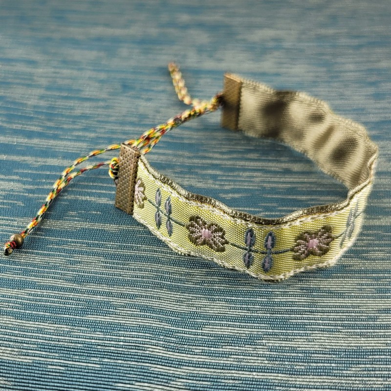 Bracelet avec un ruban kaki tissé de fleurs rétro doublé d'un satin.