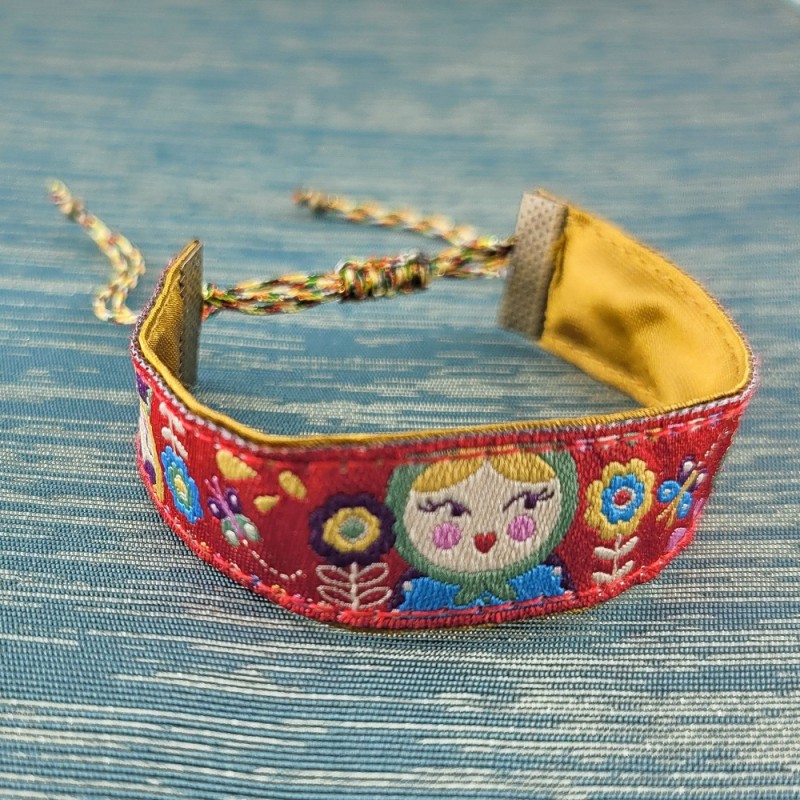 Bracelet avec un ruban tissé de jolies poupées russes doublé d'un satin.