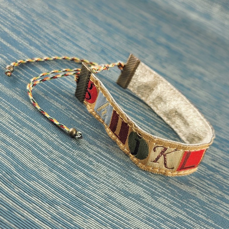 Bracelet avec un ruban rococo tissé des lettres de l'alphabet doublé d'un lamé Or.