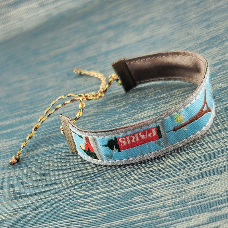 Bracelet avec un ruban inédit tissé à l'effigie de Paris doublé d'un satin.