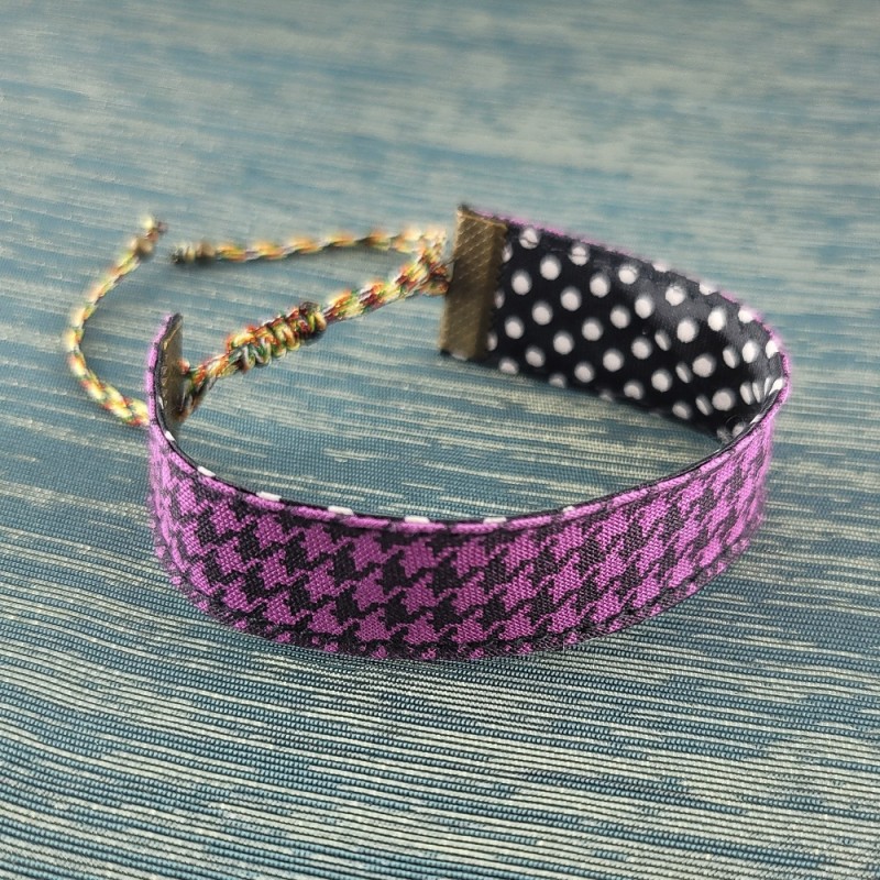 Bracelet RÉVERSIBLE avec un ruban en coton pied de poule violet doublé d'un satin à pois.