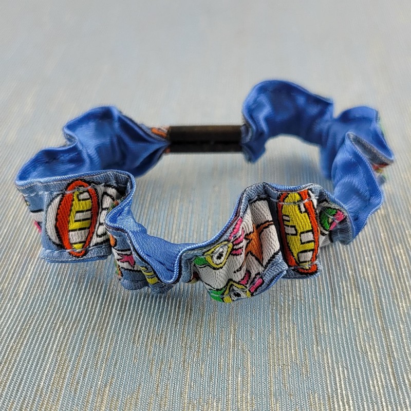 Chouchou cheveux avec un ruban tissé de têtes rigolotes doublé d'un satin.