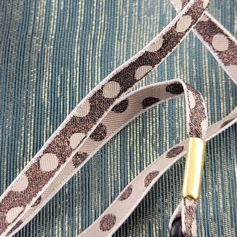 Cordon-lunettes avec un joli ruban jacquard tissé d'un motif pois beige et lurex cuivre.