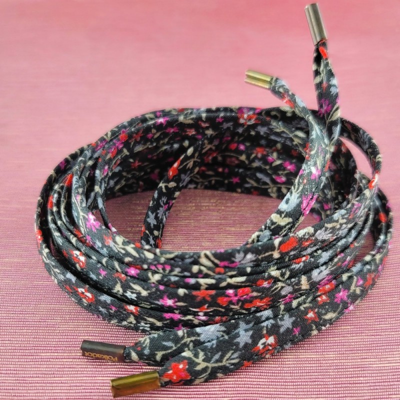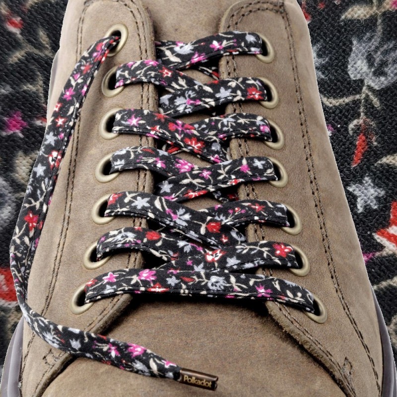 Lacets chaussures fantaisie en coton noir imprimé de fleurs d'inspiration Liberty.