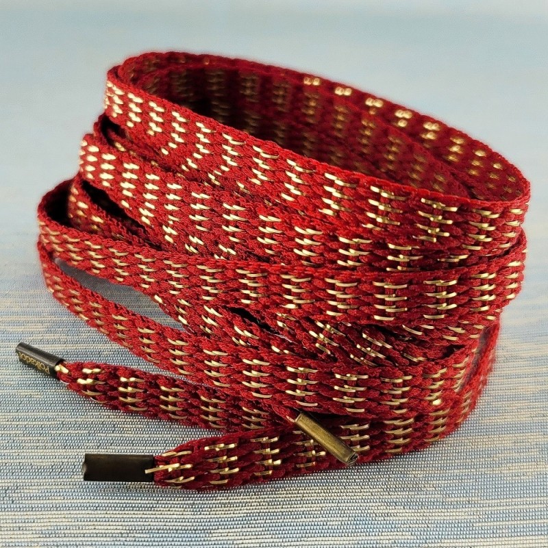 Lacets chaussures fantaisie avec un ruban tissé rouge bordeaux et lurex Or.