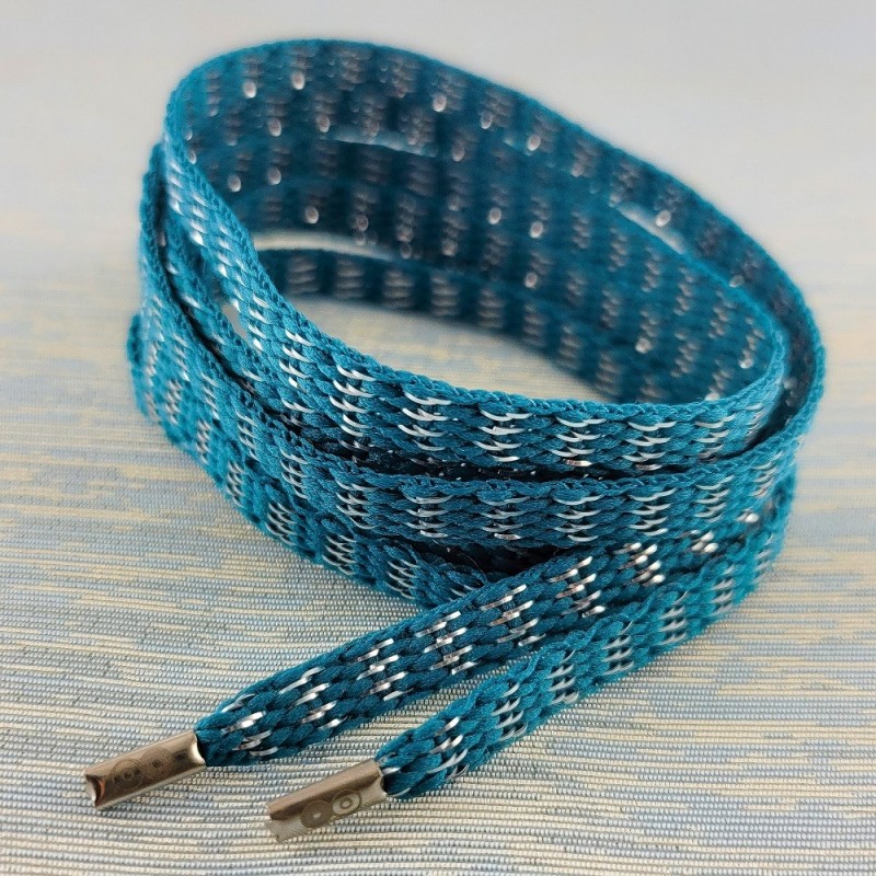 Lacets chaussures fantaisie de longueur 90cm avec un ruban tissé bleu canard et lurex argent.